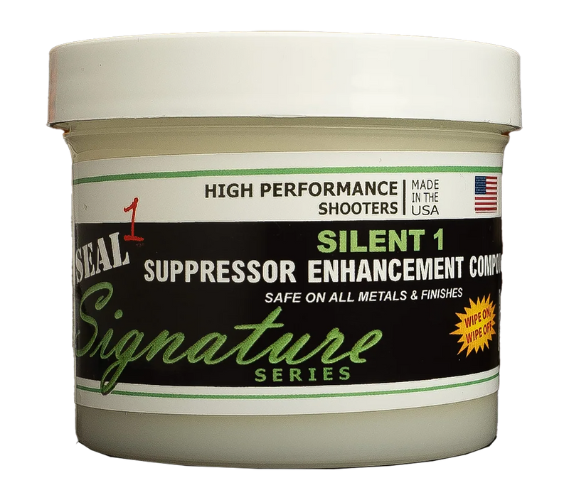 Seal 1 Silent 1 Signature is a paste-type lubricant and protectant formulated for firearm maintenance and restoration. This 4 oz jar provides long-lasting protection and smooth operation for gun mechanisms. Hazmat classified for both ground and air transport.