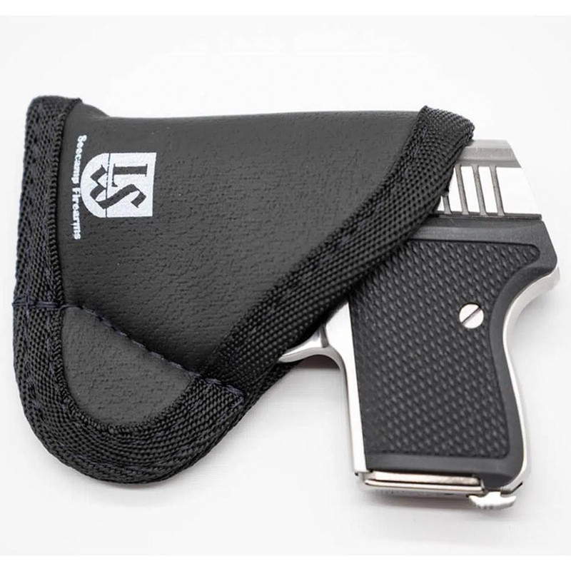 Ambidextrous pocket holster designed for compact firearms with up to 4" barrels, featuring a low-profile design suitable for waistband or pocket carry. The holster uses body heat to conform to your firearm for an improved fit over time. Weighs less than 3 oz and measures 4" x 3.5".