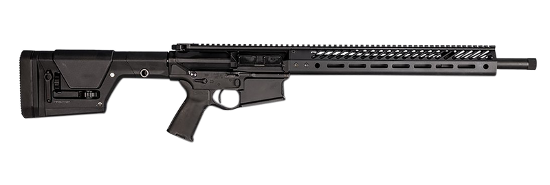 Semi-automatic AR-platform rifle chambered in .308 Winchester with an 18" match-grade Bartlein barrel (1:11.5 twist, threaded 5/8x24). Features a 15" free-float M-LOK handguard, Magpul PRS Lite stock, Magpul MOE Plus grip, single-stage trigger, and ambidextrous safety. Includes one 20-round magazine and Cerakote armor black finish.