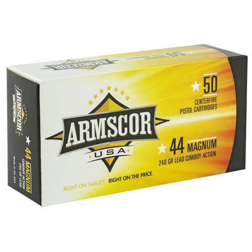 .44 Remington Magnum ammunition loaded with 240-grain semi-jacketed soft point bullets designed for hunting, self-defense, and target shooting. Features brass casings, 1280 fps muzzle velocity, and controlled expansion with high weight retention for reliable performance.