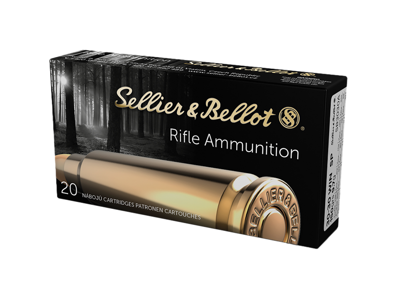 Sellier & Bellot centerfire rifle ammunition in .30-30 Winchester with 150-grain Soft Point bullets designed for medium-game hunting. Features brass casings, 2389 fps muzzle velocity, and 1900 ft-lbs muzzle energy for excellent expansion and consistent accuracy. 20 rounds per box.