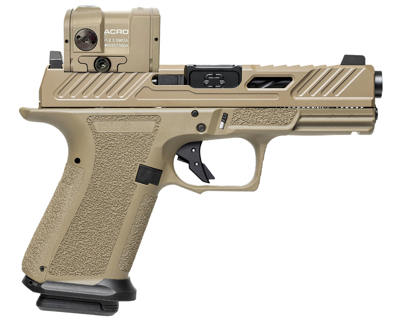 The Shadow Systems XR920 Elite is a 9mm Luger striker-fired semi-automatic pistol with a 4.5" barrel and 17+1 round capacity. This model features an optic-ready slide with window cut, tritium night sights, and interchangeable backstrap grips. The FDE finish with serrated slide comes ready to mount an Acro-pattern optic.
