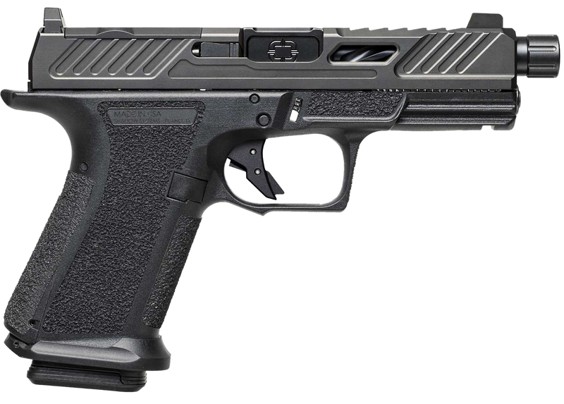 Shadow Systems MR920 Elite striker-fired semi-automatic compact pistol chambered in 9mm with a 4.5" threaded and fluted barrel. Features a nitride finish elite slide, optics-ready cut, flat-faced trigger, tritium front night sight, and polymer frame. Massachusetts compliant with 10-round capacity; includes 2 magazines and optic ready kit.