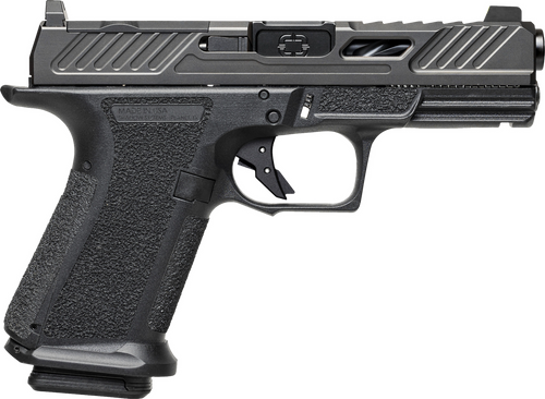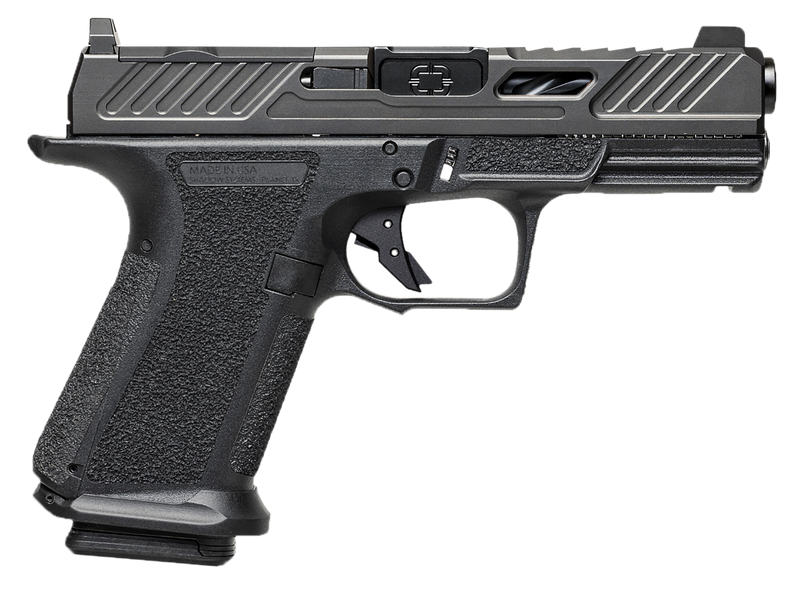 Shadow Systems MR920 Elite is a striker-fired, semi-automatic compact pistol chambered in 9mm with a 4" spiral fluted barrel and nitride finish. Massachusetts-compliant with 10-round capacity, optics-ready slide with serrated window cuts, tritium front night sight, and flat-faced trigger. Includes 2 magazines and optic ready kit.
