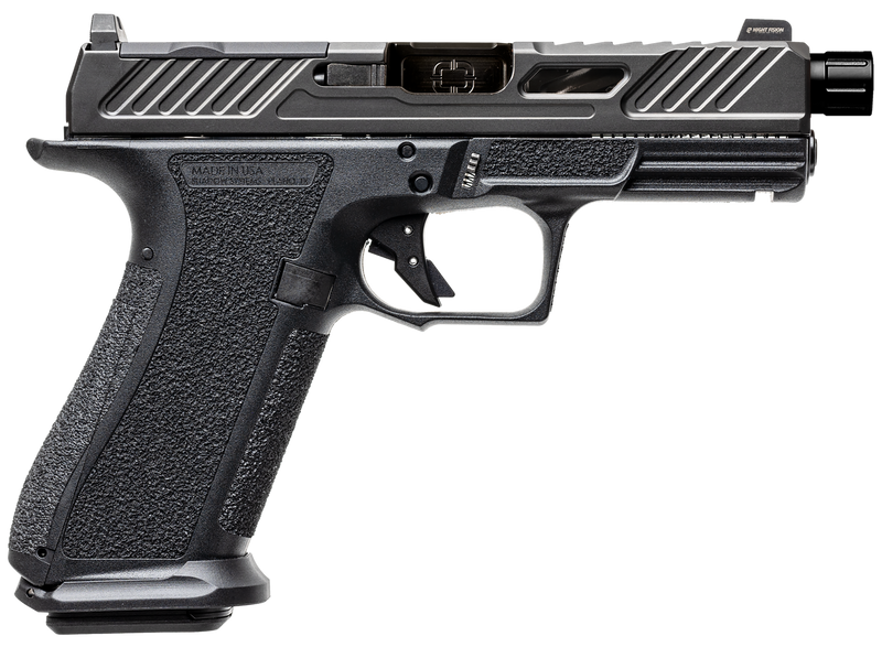 The Shadow Systems XR920 Elite is a 9mm striker-fired semi-auto pistol with a 4.5" threaded barrel and optics-ready slide featuring a spiral fluted design. It ships with two 17-round magazines, interchangeable backstraps, tritium night sights, and a flat-faced trigger. This polymer-framed pistol weighs 22.4 oz and measures 7.63" overall with a 1/2x28 thread pattern.
