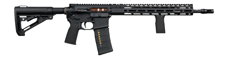 Semi-automatic tactical rifle chambered in 5.56 NATO with a 16" hybrid profile barrel and 30+1 round capacity. Features a bronze bolt carrier group, intermediate gas system, two-stage duty trigger, threaded muzzle (1/2x28), and proprietary furniture system with collapsible stock. Weighs 6.45 lbs with no iron sights.