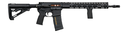 Semi-automatic rifle chambered in 5.56 NATO with a 16" threaded barrel and 10+1 round capacity, designed for California compliance. Features a DLC bolt carrier group, intermediate gas system, two-stage duty trigger, and proprietary furniture system with collapsible/folding stock. No sights installed; optic-ready platform.