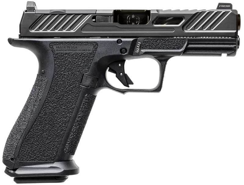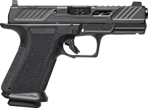 The Shadow Systems XR920 Elite is a striker-fired, semi-automatic 9mm pistol with a 4" black spiral fluted barrel and optics-ready slide featuring serrated and window cuts. This full-size polymer-frame pistol weighs 22.4 oz, features interchangeable backstraps for ergonomic adjustment, and comes California-compliant with a 10+1 capacity and night sights.