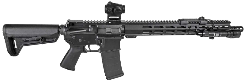 Semi-automatic AR-15 rifle chambered in 5.56 NATO with a 16" threaded barrel and 30-round capacity. Features a custom Midnight Black Cerakote finish, Magpul SL-K stock, aluminum receiver, and Picatinny rail for optics mounting. Includes Vortex Crossfire Red Dot sight, Streamlight ProTac light, and carry case.