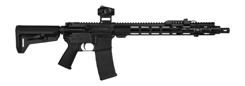 Semi-automatic AR-15 platform rifle chambered in 5.56mm with a 16" barrel and 10-round magazine capacity. Features a custom Midnight Black Cerakote finish, Vortex Crossfire Red Dot optic, ProTac 625 Lumen RailMount light, Magpul stock and grip, and includes a double rifle carry case.