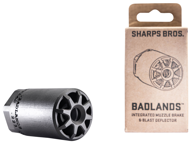 The Sharps Bros Badlands is a multi-caliber muzzle brake and blast deflector designed for rifles chambered in .223 to .354 caliber. It features a heat-treated 17-4 stainless steel construction with nitride finish for durability, measuring 2.75" in length with a 1.50" outside diameter. The brake uses 1/2"-28 thread pitch for installation and is engineered to reduce recoil and redirect muzzle blast.