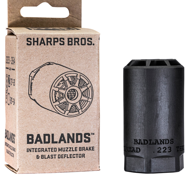 The Sharps Bros Badlands is a multi-caliber muzzle brake and blast deflector constructed from heat-treated 17-4 stainless steel with a nitride finish for durability. Designed for .223 to .354 caliber rifles, it features a 5/8"-24 tpi thread pattern and is rated for full-auto use. The device measures 2.75" in length and 1.50" in diameter, threading directly onto compatible barrel muzzles.