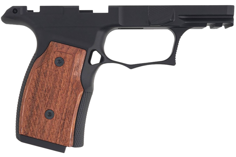 This grip module is designed for Sig P365, P365XL, P365X, and P365X Macro pistols and features a black anodized finish with Brazilian cherry grip panels. Constructed from 7075 T-6 aluminum, the G2 model includes a steel lug insert for enhanced durability and compatibility with safety-equipped variants.