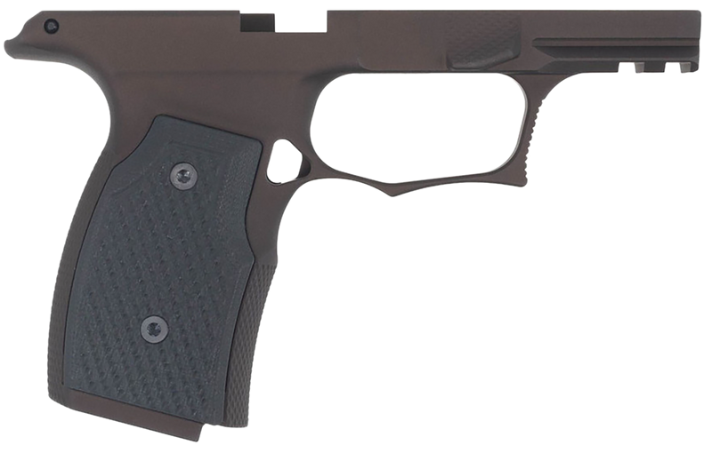 This grip module is designed for Sig Sauer P365X and P365XL pistols and features a bronze finish with black grip panels. Constructed from 7075-T6 aluminum with a matte finish, it includes a steel lug insert for secure installation.