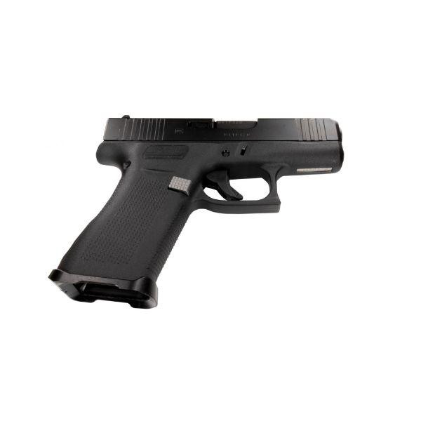 Steel magazine catch designed for Glock 43X/48 pistols, optimized for use with Shield Arms S15 magazines. Features ambidextrous design, lower profile for concealed carry, chamfered textured button, and is made in the USA with a 100% lifetime warranty.