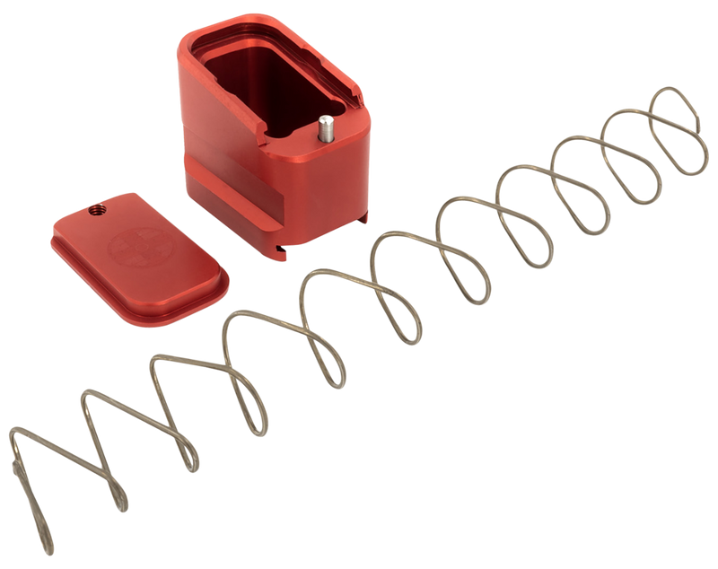 This Shield Arms magazine extension adds 5 rounds to Glock 19 magazines and 4 rounds to Glock 23 magazines in 9mm Luger and .40 S&W calibers. It features a unique easy access floor plate design for quick serviceability of the spring and follower without removing the extension from the magazine body. The red anodized aluminum construction comes with a 100% lifetime warranty and Shield Arms Spring for Life guarantee.