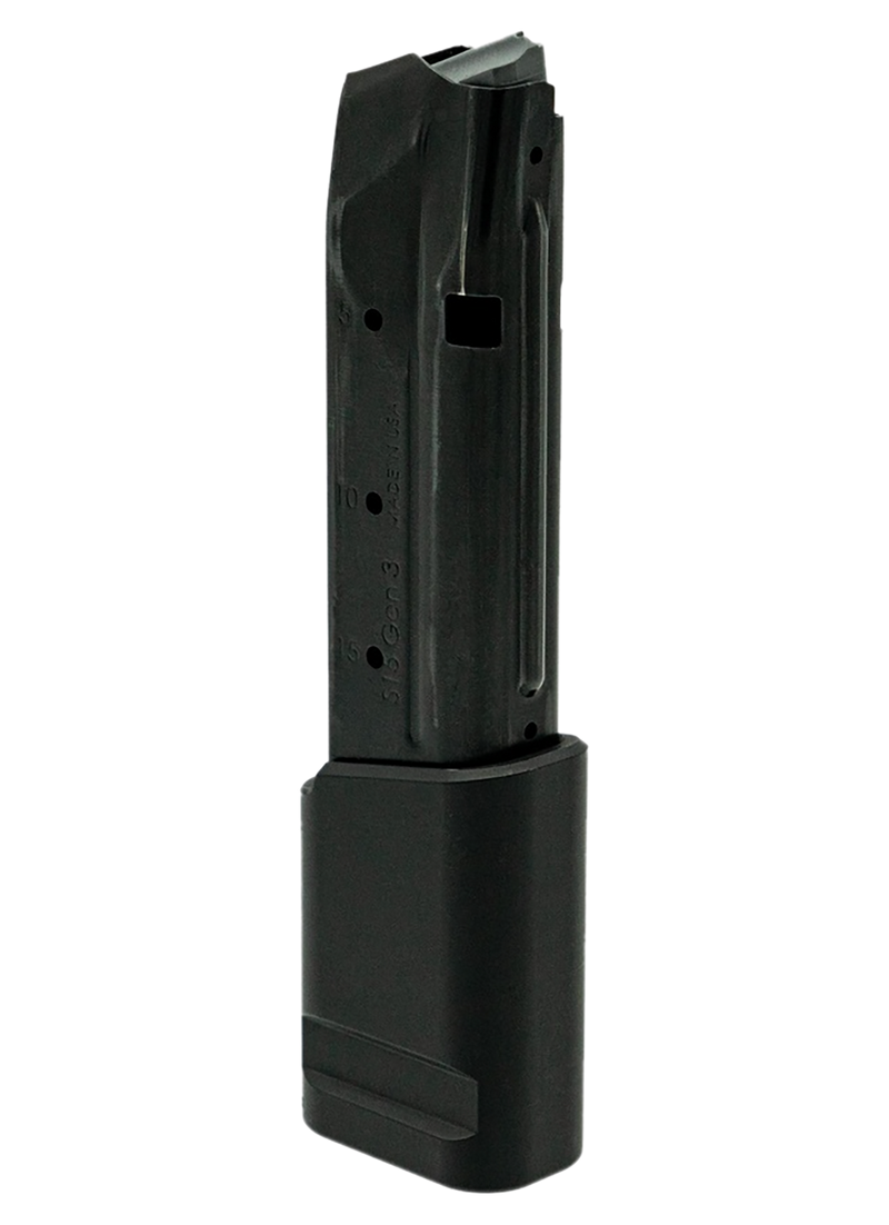 This is a pre-installed magazine extension for the Shield Arms S15 handgun magazine, increasing capacity by 10 rounds. Constructed from black aluminum with Nitrocarb coating, the extension is designed for compatibility with Shield Arms S15 magazines. Dimensions are 8.8" x 6.9" x 1.5".