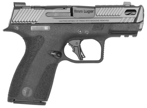 The M&P9 Shield X Carry Comp is a 9mm striker-fired semi-auto pistol with a 3.6" barrel and 13+1 capacity. This polymer-framed carry pistol features an optics-cut slide, flat-face trigger, and PowerPort compensator for reduced recoil. Includes night sights (LumiGreen front, black rear) and weighs 20.6 oz unloaded.