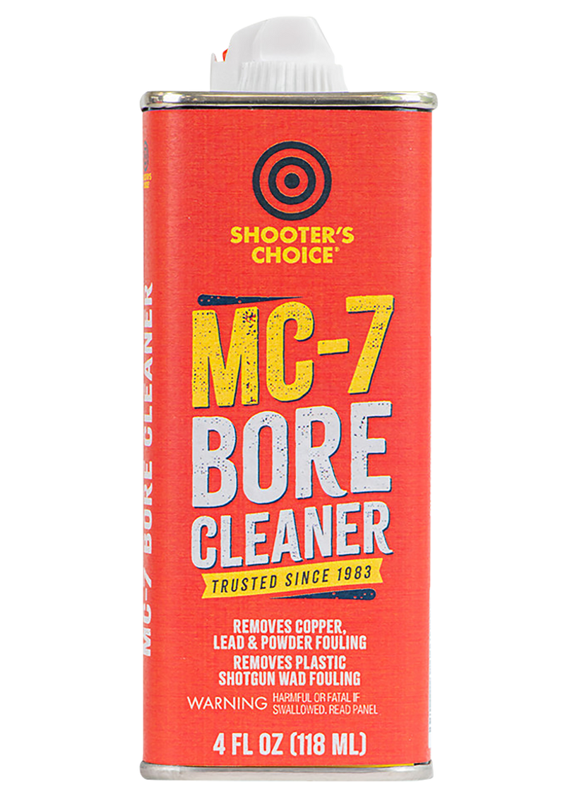 Shooter's Choice MC-7 is a liquid bore cleaner and conditioner designed to dissolve and remove copper, powder fouling, plastic wad residue, lead, and carbon deposits from firearm bores. It prevents rust and corrosion while conditioning the bore to resist fouling, and lubricates without being abrasive or damaging the original bore finish. Packaged in a 4 oz glass bottle.