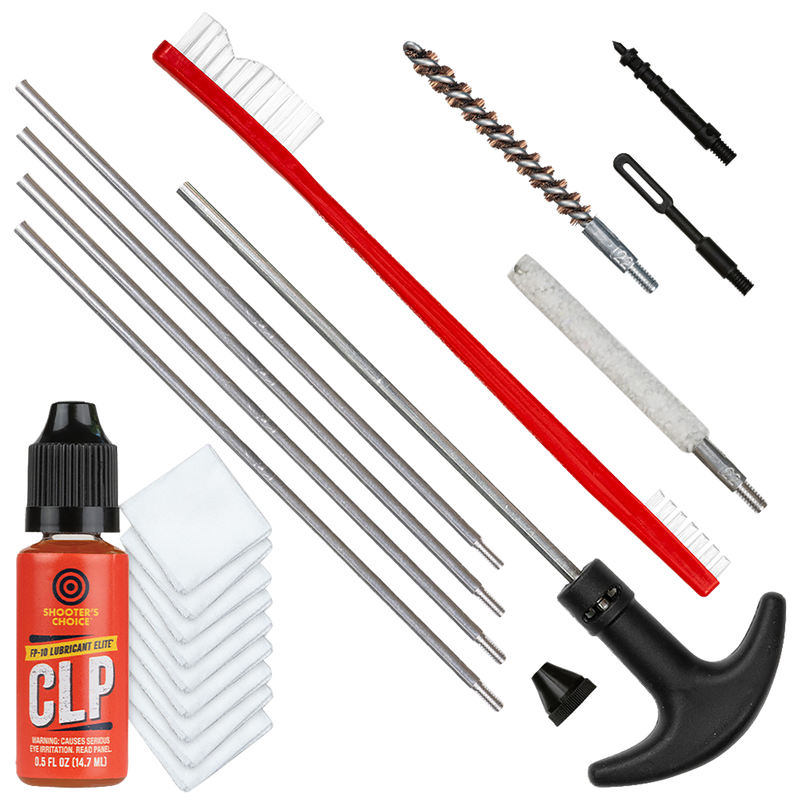 This 13-piece cleaning kit is designed for .22 caliber and .223 caliber rifles and includes an aluminum rod with swivel t-handle, bore guide, brush, mop, jag, slotted tip, and patches. The kit also contains an all-purpose brush and FP-10 Lubricant Elite CLP to maintain proper firearm lubrication and operation.