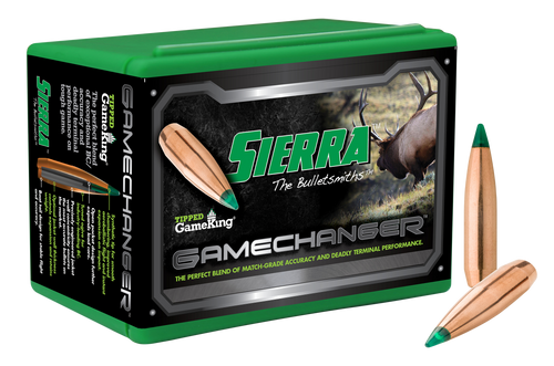 Sierra Tipped GameKing bullets in .308 caliber feature a ballistic polymer tip and open pocket design for controlled expansion and weight retention on impact. These 165-grain jacketed lead bullets are engineered for hunting applications with a boat-tail design and tuned ogive for improved ballistic coefficient and accuracy. Packaged as 100 count per box.
