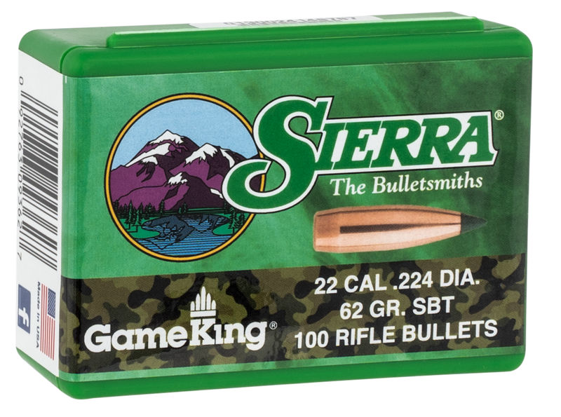 Sierra GameKing 62 grain spitzer boat tail bullets designed for .224" caliber rifles, featuring a copper jacket with lead core for hunting applications. Each box contains 100 bullets with a sectional density of .157 and high ballistic coefficients that resist crosswinds and retain velocity well. These medium-weight bullets are engineered for penetration and expansion in medium to large game.