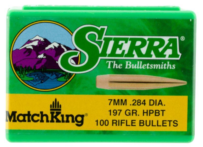 Sierra MatchKing 7mm/.284" 197 grain hollow point boat tail (HPBT) rifle bullets designed for precision target shooting and long-range performance. Features a 27 caliber elongated ogive and final meplat reducing operation for increased ballistic coefficient and velocity retention. Packaged 100 rounds per box with jacketed lead construction and .349 sectional density.