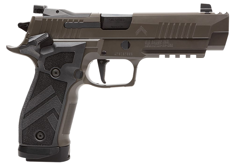 The P226 X-Five Legion is a 9mm semi-automatic pistol with a 4.4" barrel and 10+1 capacity, featuring an innovative slide-integrated expansion chamber for reduced recoil. It includes a fully-adjustable flat-faced trigger, suppressor-height X-Ray3 sights, Legion Gray Cerakote finish, and custom TXG grip panels with integrated magwell. This full-size, optic-ready handgun weighs 42.4 oz and measures 8.6" overall.