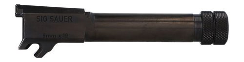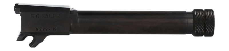 Factory replacement threaded barrel for the Sig Sauer P365 pistol chambered in 9mm with a 4.3" length and 1/2-28 thread pitch. Features nitride finish for durability, loaded chamber indicator (LCI) witness hole, and includes a thread protector cap. Compatible with P365, P365-XL, and P365-XMACRO (non-comp) slides.