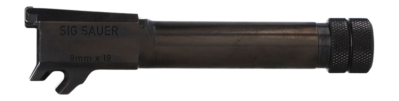 Factory replacement threaded barrel for Sig Sauer P365 and P365-X pistols chambered in 9mm with a 3.7" length and 1/2-28 thread pitch. Features nitride finish, loaded chamber indicator (LCI) witness hole, and includes a thread protector cap. Designed for use with compensators or suppressors.
