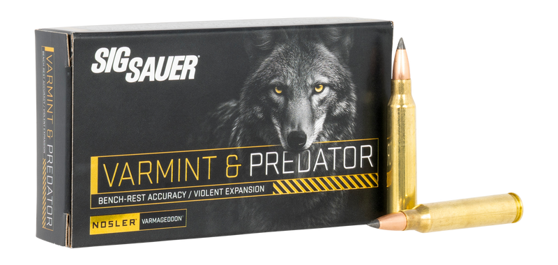 Sig Sauer Varmageddon ammunition in 223 Rem with 55-grain bullets designed for varmint and predator hunting. Packaged as 20 rounds per box with 10 boxes per case. Optimized for accuracy and expansion on medium-sized game and varmints.