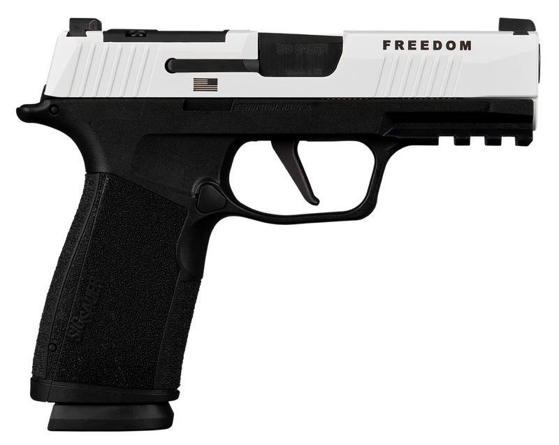 The Sig Sauer P365 X-Macro Freedom is a striker-fired 9mm semi-auto pistol with a 3.7" barrel, 17+1 capacity, and optic-ready slide featuring white Cerakote finish with Freedom engraving. This compact handgun includes X-RAY 3 day/night sights, polymer frame with black X-Macro grip module, and two 17-round steel magazines, weighing 21.8 oz. Part of the limited-edition Freedom Series with $50 donated to Turning Point USA for every pistol sold.