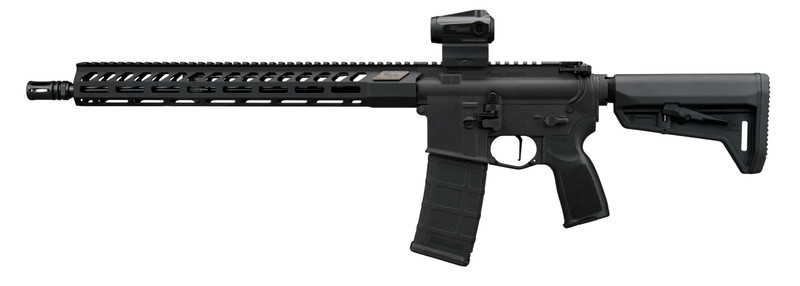 Semi-automatic rifle chambered in 5.56 NATO with a 16" barrel, matte black finish, and 30-round capacity. Features a 6-position collapsible MAGPUL SL-K stock, 15" M-LOK handguard, TriggerTech two-stage flat trigger, and Romeo-MSR Gen2 2 MOA red dot optic. Overall length is 35.5" and weighs 6.8 lbs.