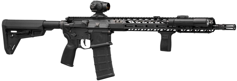 Semi-automatic AR-platform rifle chambered in 5.56 NATO with a 16" threaded barrel and 1:7" twist rate. Features a 2-Stage Matchlite Duo trigger, ambidextrous controls, Magpul MOE-SL collapsible stock, and includes a ROMEO5 Gen II red dot sight and Foxtrot-MSR light. Overall length is 36.5" and weighs approximately 8 lbs.