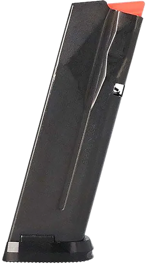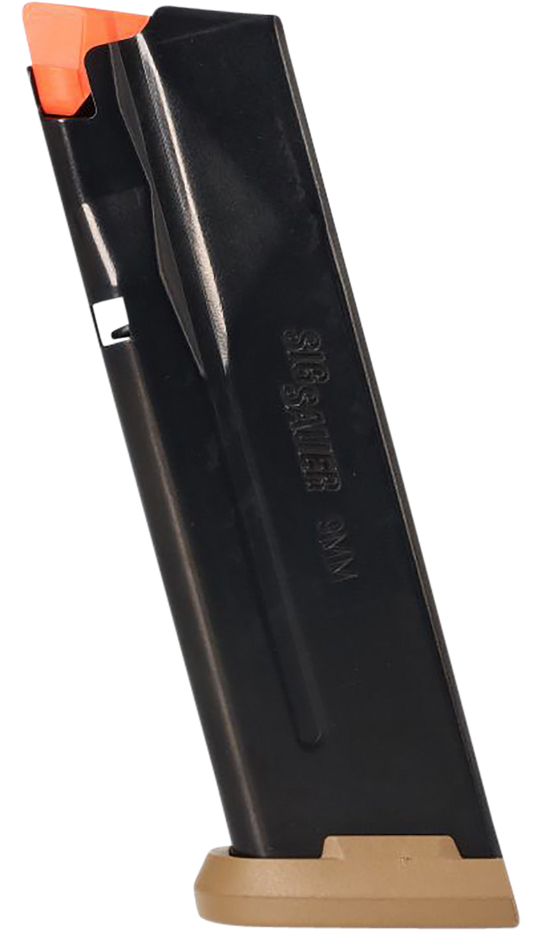 Factory 17-round steel magazine for the Sig Sauer P365-XMACRO in 9mm Luger, compatible with all P365 9mm models. Features rear witness holes for capacity confirmation, orange follower for easy identification, and includes two interchangeable floor plates to fit different P365 grip lengths.