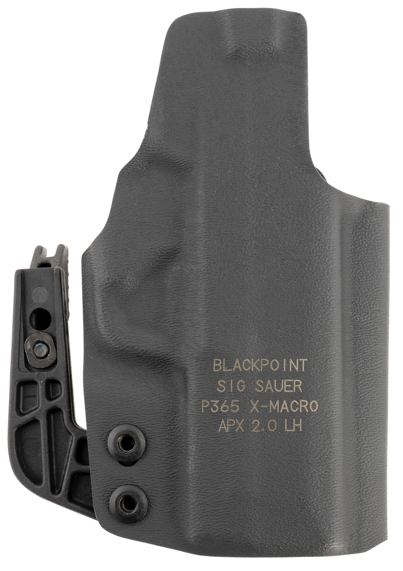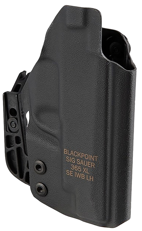This left-hand tactical holster is designed to fit the Sig P365 pistol. It features a minimal appendix carry design with a concealment strut for enhanced concealment and adjustable height positioning. The holster is compatible with or without a ROMEOZero sight installed.