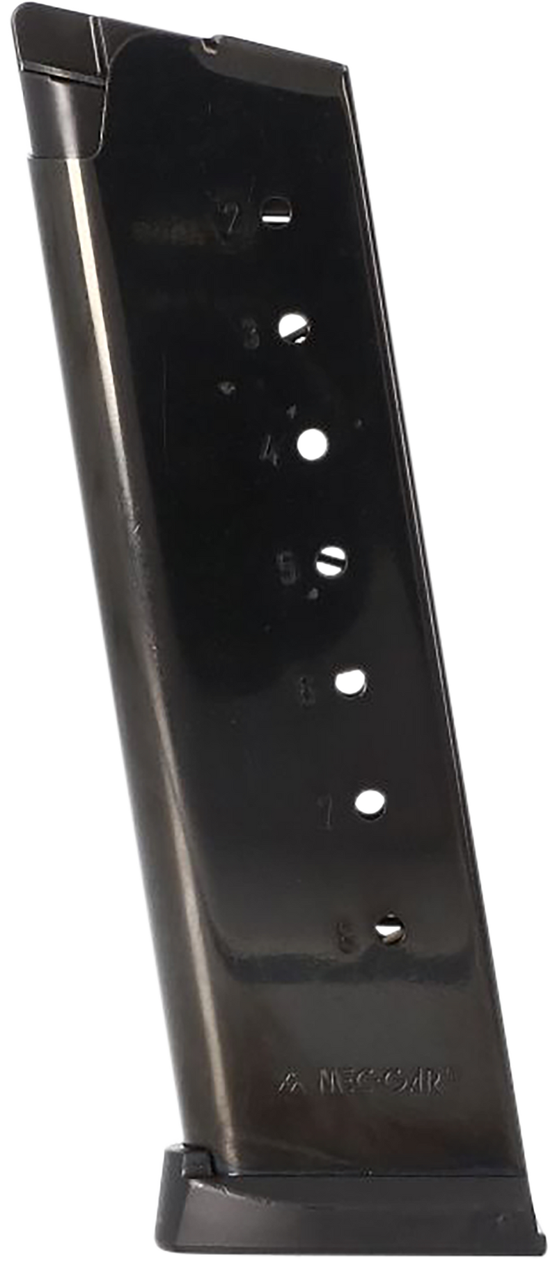 This is an 8-round steel magazine for Sig Sauer's full-size 1911 X-Series pistol in 45 Auto. The magazine features side witness holes for quick capacity confirmation and a black oxide finish with polymer baseplate for durability and reliable feeding.