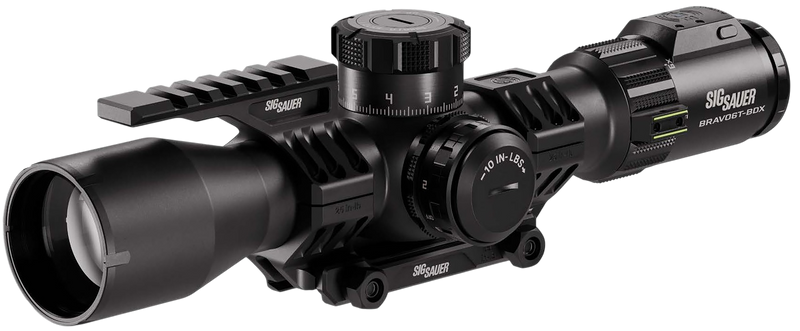 The Bravo6T-BDX is a 3-18x44mm first focal plane riflescope with a 35mm tube and illuminated MRAD DEV-L 2.0 reticle. It features Sig Sauer's eTRAK elevation dial with ZeroSync technology that integrates ballistic computation to display shoot-to distance, eliminating the need for ballistic charts. Weighing 22.7 oz with 0.1 MRAD adjustments, it includes an Alpha5 mount with LRF diving board and offers Bluetooth connectivity for advanced ballistic data management.