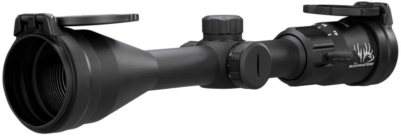 Variable power 3-9x50mm riflescope with 1-inch main tube and illuminated Hellfire Buckmasters BDC reticle featuring holdover dots out to 500 yards. Includes six brightness settings for use in various lighting conditions, second focal plane adjustment, and 0.25 MOA clicks. Waterproof, shockproof, weighs 15.9 oz with 98-106mm eye relief.