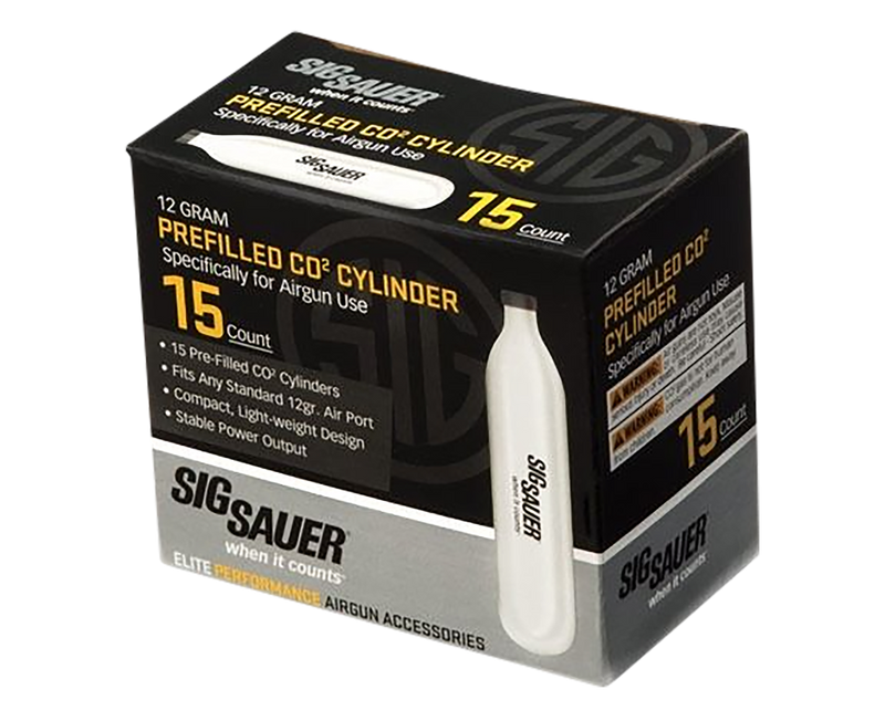 Sig Sauer prefilled CO2 cartridges in 12 gram size, packaged with 15 cylinders per pack. These cylinders feature compact lightweight design with stable power output and are compatible with 12gr air ports on Sig Sauer airguns.