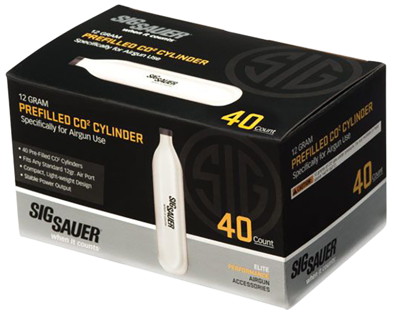 Sig Sauer premium CO2 cartridges designed for use with Sig ASP airguns and any standard neck air ports. Each box contains 40 individual 12-gram cylinders engineered for consistent performance and extended airgun lifespan. Higher-quality cleaner gas formulation supports precision accuracy and reliability.