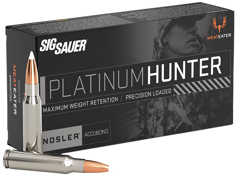 Sig Sauer Platinum Hunter ammunition in 7mm Remington Magnum with 160-grain Nosler Accubond bullets, loaded 20 rounds per box. Features nickel-plated corrosion-resistant cases, waterproofing for extreme weather, and is designed for precision big game hunting with excellent weight retention and deep penetration.
