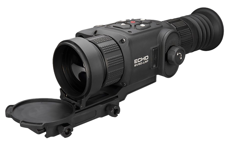 The Sig Sauer Echo SV50-LRF is a thermal weapon sight with a 2-16x magnification range and 50mm objective lens, featuring a 640x512 thermal sensor core resolution. It includes BDX 2.0 ballistic technology, an integrated 1000-yard rangefinder, 8 selectable color palettes, and operates on two 18650 rechargeable lithium-ion batteries with approximately 11 hours of runtime. The sight mounts via 1913 Picatinny rail and delivers customizable reticle options for precision shooting.