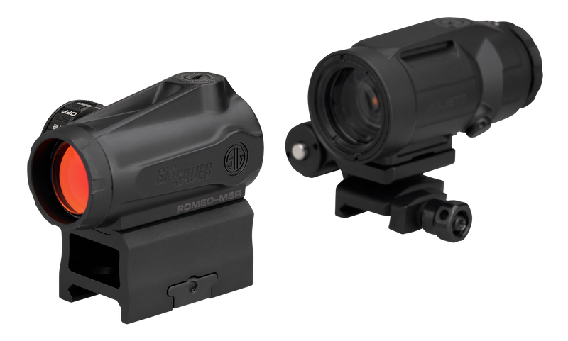 The Sig Sauer Romeo-MSR Gen II combined with the Juliet5 Micro Magnifier delivers 1x and 5x magnification options with 20mm and 42mm objective lenses respectively. The system features a 2 MOA red dot reticle with 12 illumination brightness settings including two dedicated night vision options, optimized for MSR rifle platforms. Both optics are fog and waterproof with adjustable windage and elevation, and mount to standard M1913 Picatinny rails.