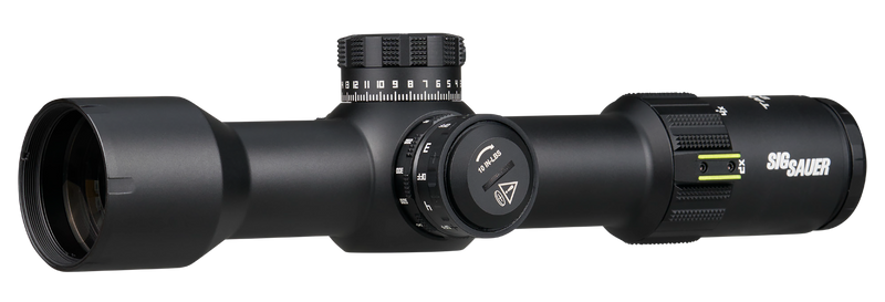 The Sig Sauer Tango-DMR is a 2-12x magnification riflescope with a 42mm objective lens and 34mm main tube, featuring an illuminated MRAD Milling 2.0 reticle in first focal plane. It includes a zero stop elevation dial, side focus adjustment, and multi-turn dial with 0.1 MRAD click adjustments. This 25.2 oz scope is fog-proof, shockproof, and waterproof with LensArmor/SpectraCoat optical coatings and 3.7-3.9 inches of eye relief.