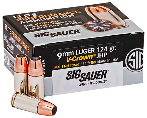 Sig Sauer Elite V-Crown 9mm Luger 124gr JHP Handgun Ammunition 50rd - SIG E9MMA250