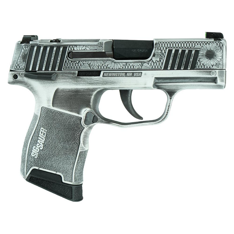 Semi-auto micro-compact pistol chambered in 380 Auto with a 3.1" barrel and 10-round capacity. Features SIGLITE night sights and manual safety. This exclusive "Sun Flower" variant offers softer recoil and easier handling compared to 9mm versions, with two 10-round steel magazines included.