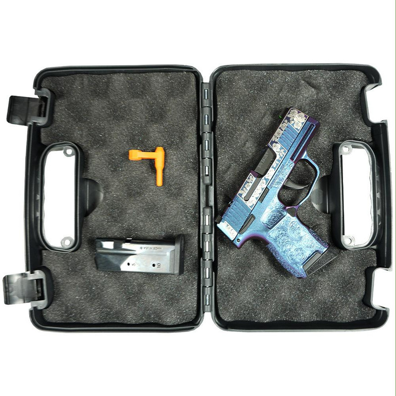 The Sig Sauer P365 is a 9mm Luger semi-automatic micro-compact pistol with a 3.1" barrel and 10-round magazine capacity. It features X-RAY 3 day/night sights, optic-ready RMS-c mounting, and weighs 17.8 oz for easy carry. This exclusive "Gun & Roses-Mongoose Purple" edition includes two steel magazines and measures 5.8" overall length.