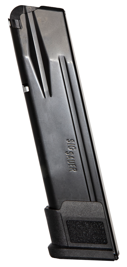 13-round detachable magazine for Sig Sauer P320 and P250 compact pistols chambered in .40 S&W or .357 Sig. Constructed of blued/black oxide steel with dimensions of 8.5" length x 3.5" width x 1.6" height. Compatible with compact models only.