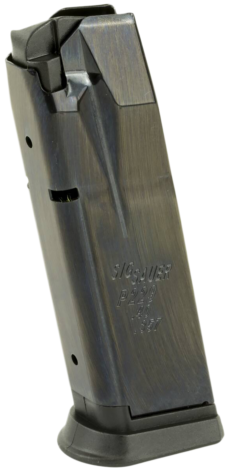 Sig Sauer OEM magazine for the P229 pistol chambered in .40 S&W and .357 Sig with 10-round capacity. Features blued steel construction and detachable design for reliable feeding and easy maintenance.
